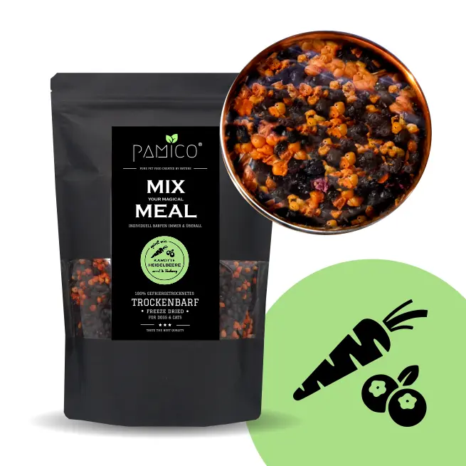 ✅ Enkel og naturlig grønnsakskomponent En ferdigblandet grønnsaks- og bærblanding med 70 % gulrot og 30 % blåbær, frysetørket uten tilsetningsstoffer. En klassisk og næringsrik kombinasjon som passer godt i BARF-kosten.
